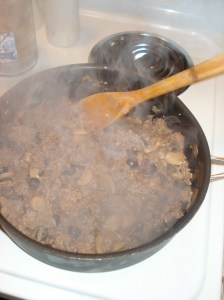 1. Heat teaspoon olive olive oil. Add onion and garlic, until bright yellow colored.  Then add ground beef and cook until browned. Add green peppers, mushrooms, and black olives.