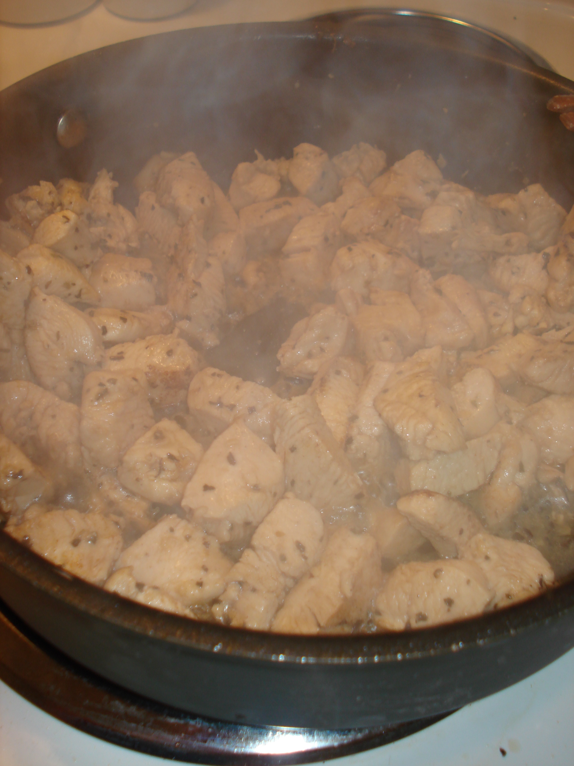 2. Heat a large skillet and 1 tablespoon of olive oil. Add chicken, garlic and basil; cook diced chicken.