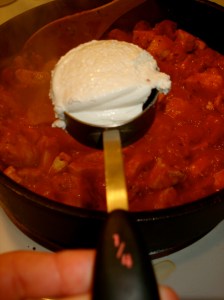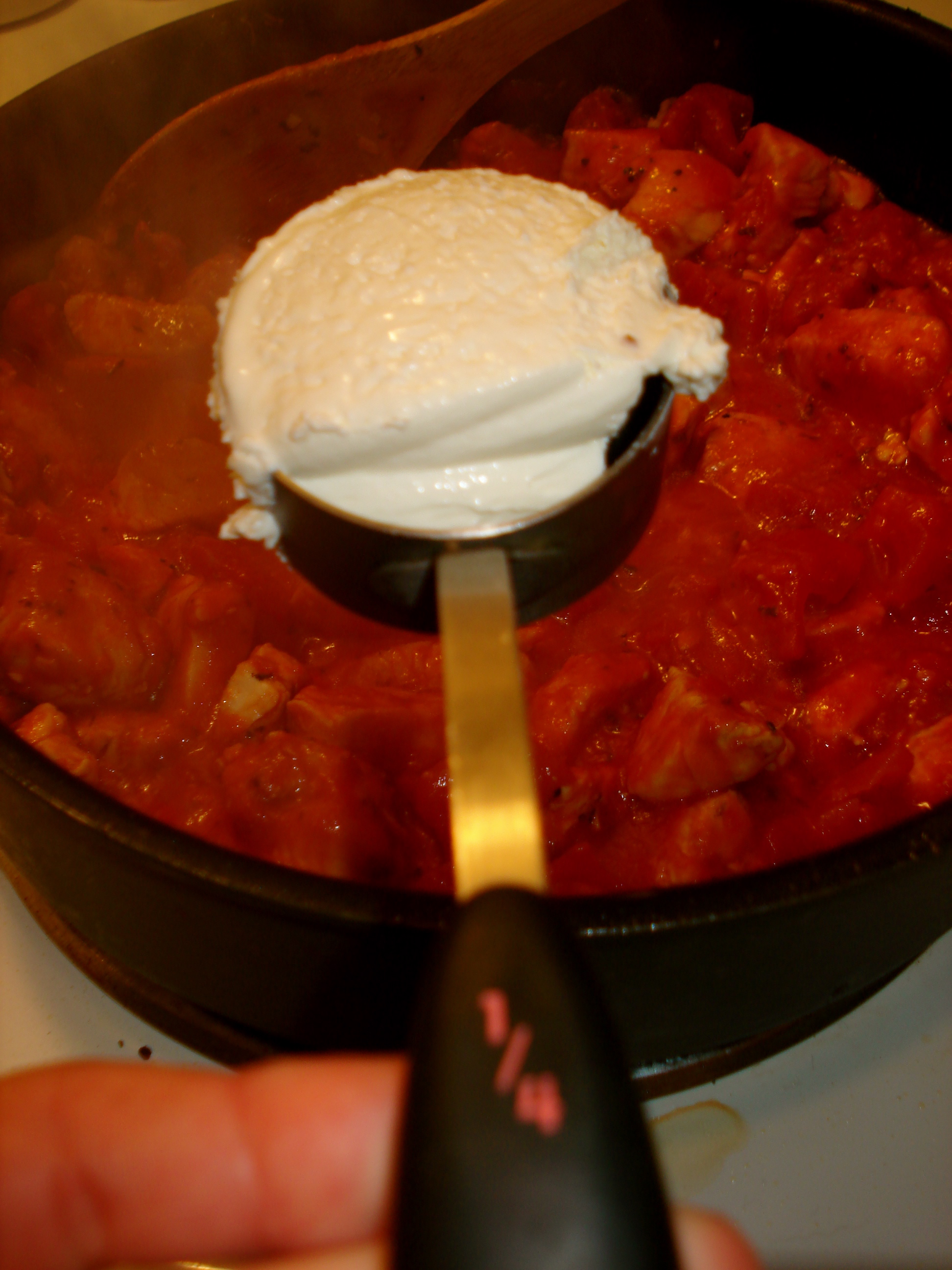 3. Add 2 cups of pasta sauce and 1 1/2 cups of diced tomatoes; bring to boil. Stir in 1/4 cup of cream cheese spread until melted.