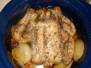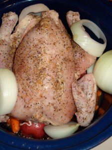 This recipe requires that an entire small chicken be put in the crockpot….I have to admit, this sounded pretty scary to me. So as I was doing some recipe-research, the very first recipe I found told me to put balls of foil on the bottom of the crockpot and then place the chicken on top and allow to cook for 8 hours on low…that sounds dangerous right? Or maybe it’s just me. I just pictured myself coming home to a house in flames, due to balls of foil…
