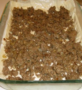 4.  Once half way through philo dough sheets, add cooked ground beef evenly. Continue layering philo dough sheets, still adding butter between every 3-4 sheets.  Once last sheet has been placed, section with knife into sizes that you’d like to serve.  Place final layer of butter.